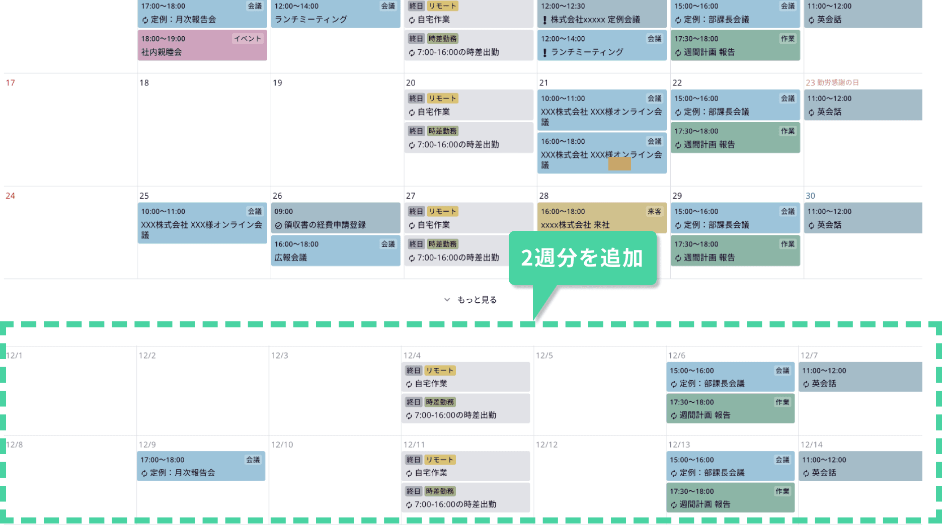 「月表示」では、翌月の2週分の予定を表示でき、月末月初の予定を1画面中で見ることができます。