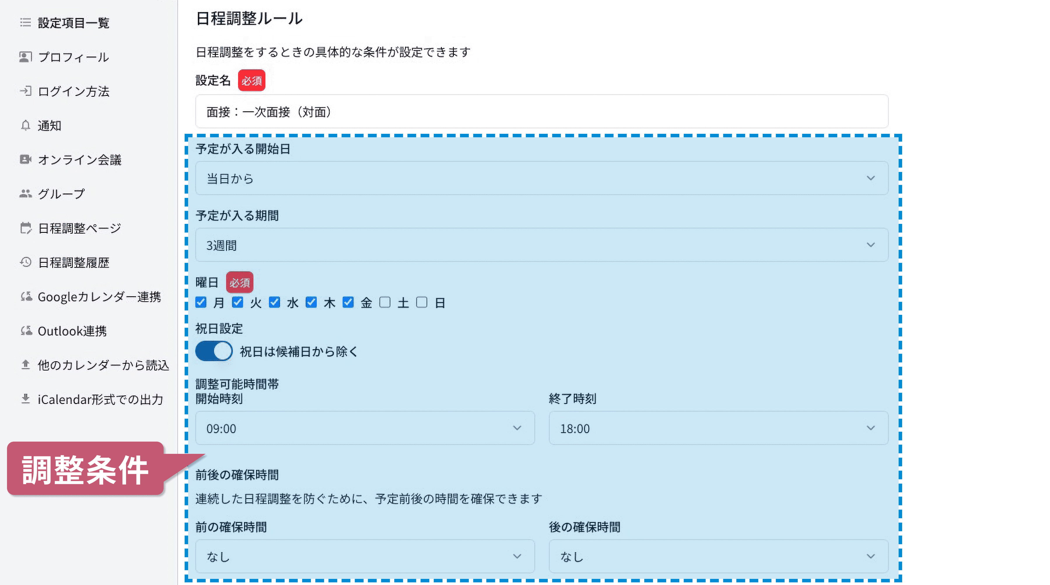 より柔軟に日程調整を行うためには、受付期間、曜日、時間帯などの日程条件や、予定前後の空き時間、参加メンバーや施設の参加条件を設定します。また、オンライン会議用のURLも自動で発行可能です。
